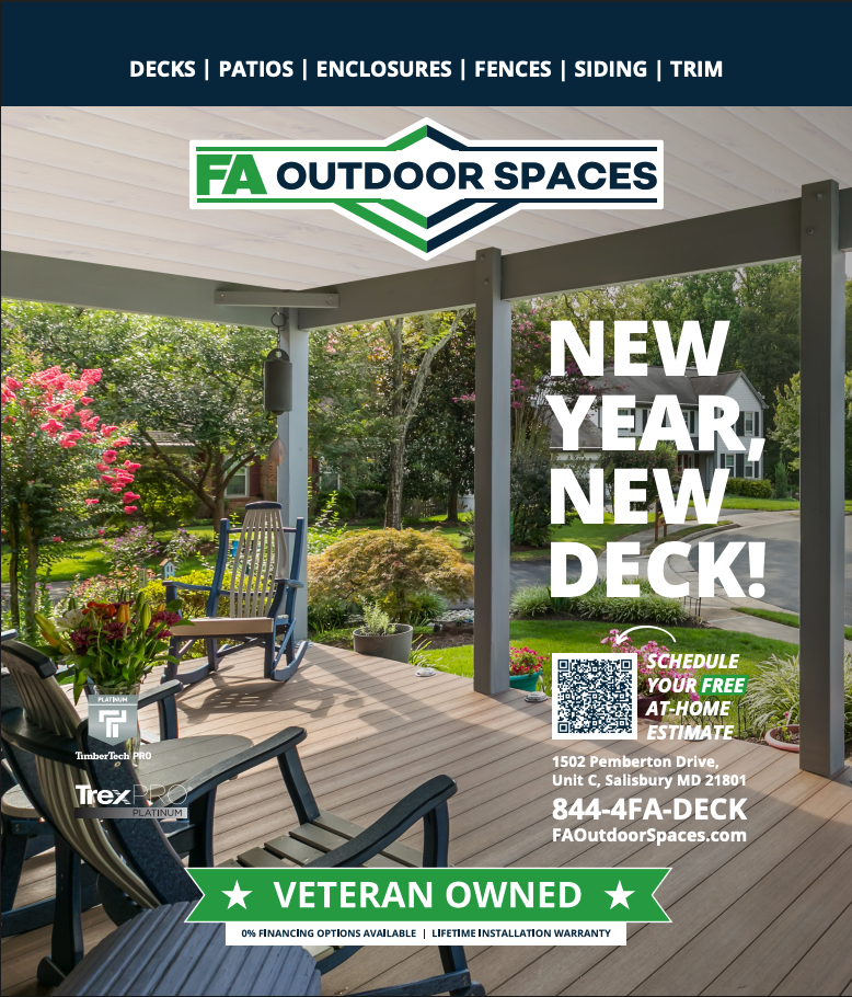 This is more clearly shown in this piece shown below. This was an ad we developed for the January issue of Coastal Style Magazine, a high end lifestyle magazine published in the Eastern Shore. The audience is more affluent and elevated than our typical direct mailers, so we opted to remove some of the discount language or package descriptions we usually use. It was important to us that we use a high quality photo of a deck FA built themselves, and that we let that image tell its own story.